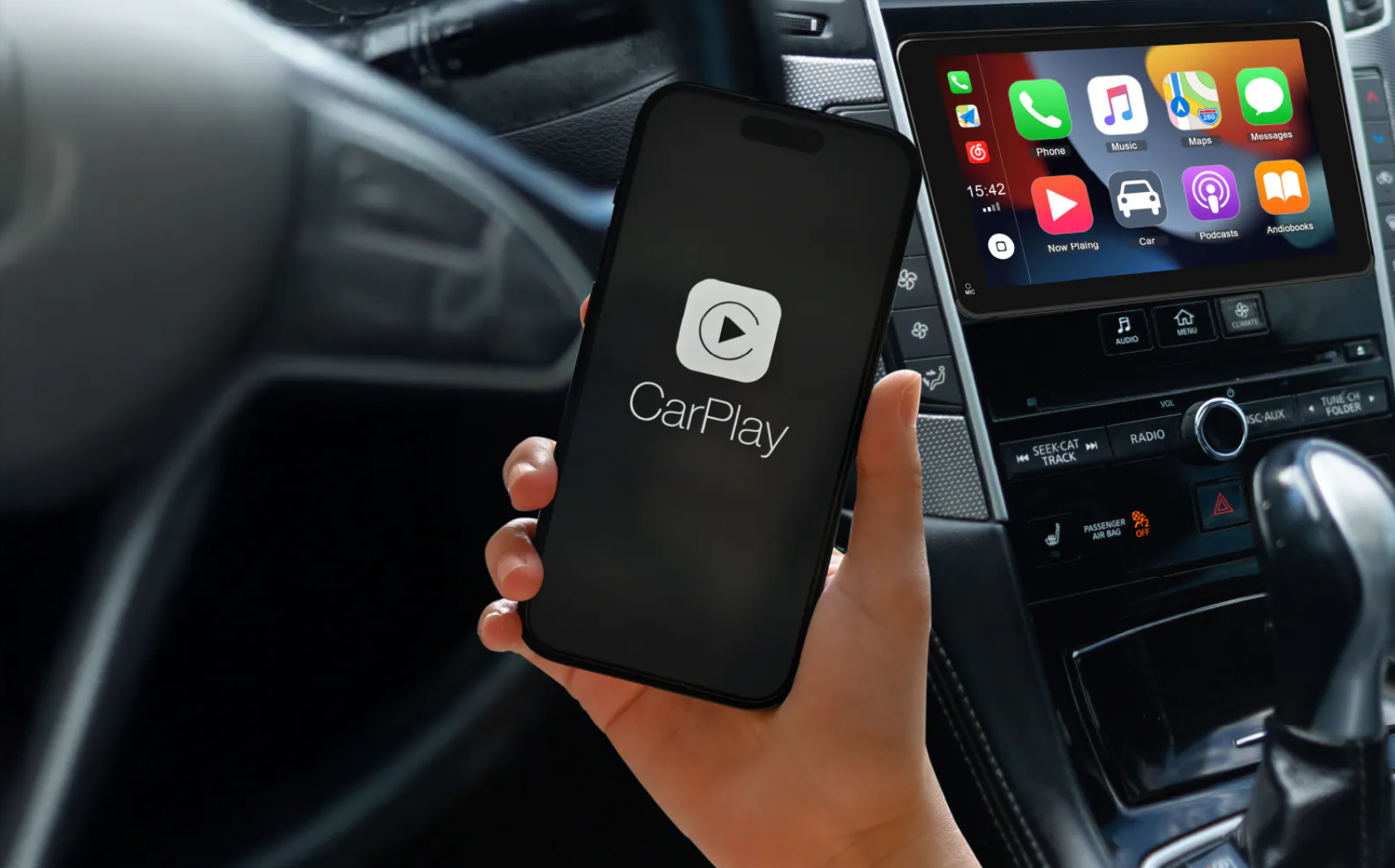 - Harde voorwaarde: Uw voertuig moet af fabriek zijn uitgerust met een bedraad CarPlay- of Android Auto-systeem.